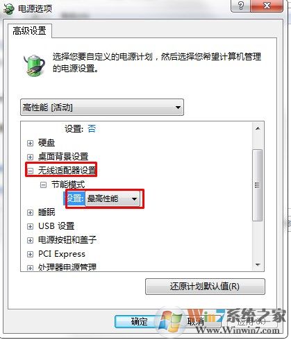 5、找到无线适配器设置,然后选择最高性能