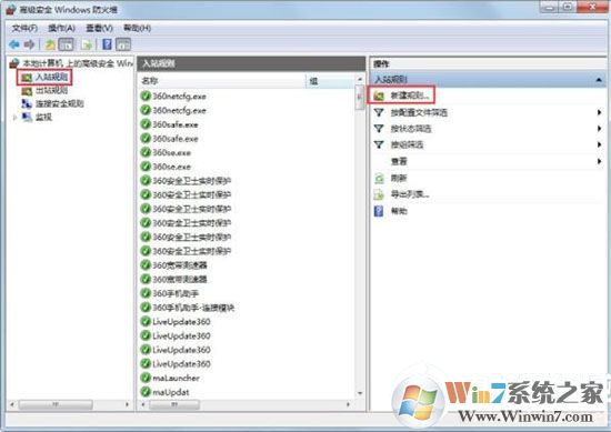 4、点击入站规则,选择右侧的新建规则,如下图所示;