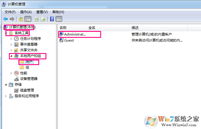 4、在右侧依次展开“计算机管理”--“系统工具”--“本地用户和组”--“用户”;