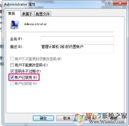 5、在右侧双击打开“administrator”,将“帐户已停用”前面的勾去掉,点击应用并确定即可,重启计算机即可正进入。