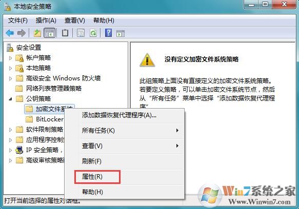 win7系统禁用EFS加密功能的方法  2、 “安全设置——公钥策略——加密文件系统”项。然后在“加密文件系统”上右击,选择“属性”。win7系统禁用EFS加密功能的方法  3、 在“常规”标签页中,将“使用加密文件系统的文件加密”设置为“不允许”,再按“确定”保存设置。