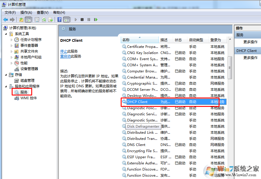3、如果win7系统dns服务器出现问题,有必要将网卡禁用,再重启看看。或是在控件面板上,点击“管理工具”-“服务”,在服务面板上找到dhcp client服务并设置为自动,再把该服务启动起来即可。