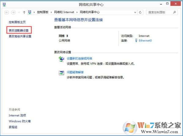 2、打开“网络和共享中心”窗口,在左侧单击“更改适配器设置”;如图所示: