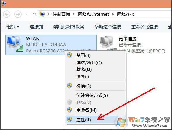 3、右击“WLAN”图标,然后点击“属性(R)”按钮(如果连接的是网线的话,就右击“本地连接”图标,然后点击“属性(R)”按钮);如图所示: