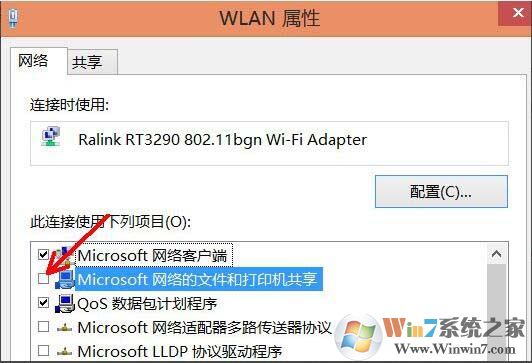 4、在对话框中禁用Microsoft网络的文件和打印机共享功能;如图所示: