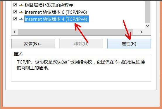 5、选中Internet协议版本4,点击“属性(R)”按钮;如图所示: