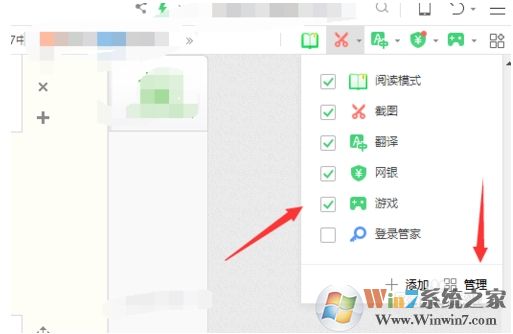 将“游戏”前面的框框取消勾选。或者点击图示箭头处的“管理”,进入加载项管理页。