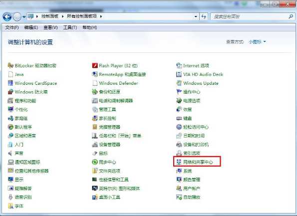 2.打开控制面板之后,找到并打开“网络和共享中心”这个选项。如图二
