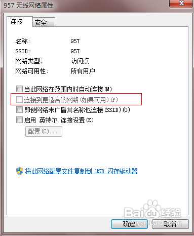 8、在无线连接设置中,可以设置自动连接、连接隐藏无线等,如果你周围有多个网络的话,而且网络不稳定的话,最好把第二项取消选择