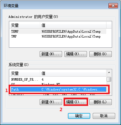 在1处选择Path变量,然后,单击“编辑(I)...”按钮,出现如下对话框: