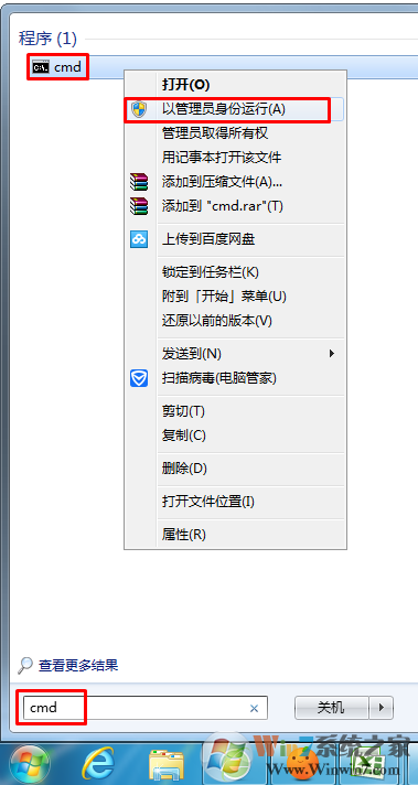 1、开始-搜索栏输入cmd-右键选择以管理员省份运行