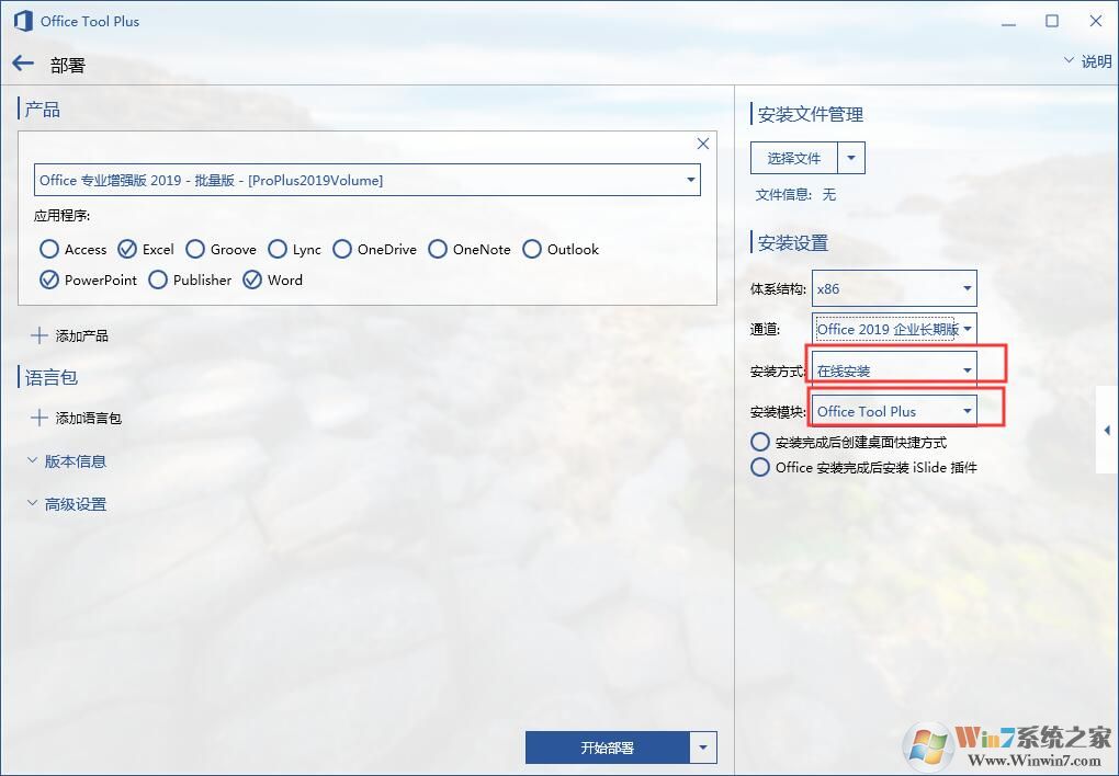 2、打开之后,我们选择Office专业增强版2019-批量版,然后勾选你要安装的组件,小编只选择安装三套件,右侧安装方式选择在线安装、安装模块默认Office tool plus。点击开始部署;(注,通道选择半年通道即可)
