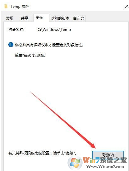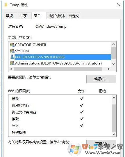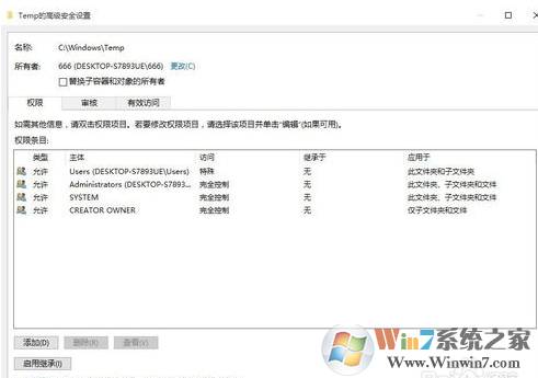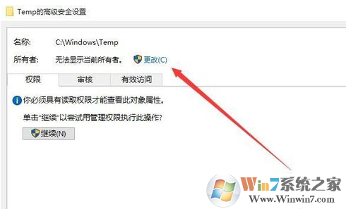 5、这时会打开temp的高级安全设置窗口,点击“所有者”后面的更改按钮