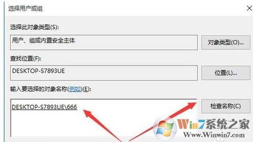 6、在打开的选择用户或组窗口中,在下面的文本框中输入你的账号名称,然后点击“检查名称”按钮,这时会在左侧的文本框中显示出账号的全称,点击确定按钮
