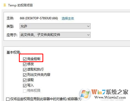 8、在打开的权限项目窗口中,修改用户的权限为“完全控制”,最后点击确定按钮保存退出。