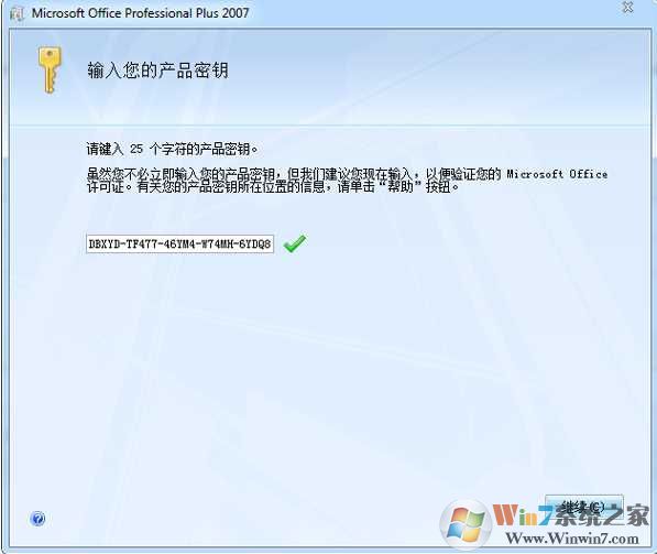 如上图界面时输入密钥,下一步即即可激活Office2007免费使用。