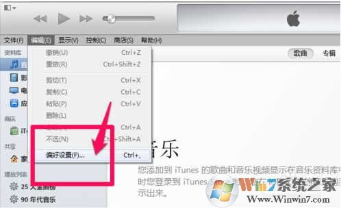 1、打开itunes然后点击编辑—偏好设置;