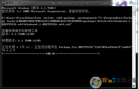 4.以管理员身份运行cmd,输入“dism /online /add-package /packagepath:”冒号后面加上上一步解压后的cab文件的位置,回车