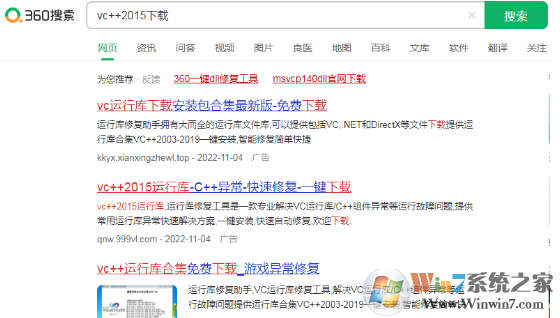 2.打开浏览器搜索对应版本的VC++运行库2015并安装