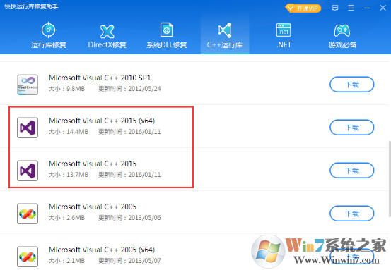 2.扫描完成后点击修复即可或者在C++运行库版面找到VC++2015运行库的安装包下载安装