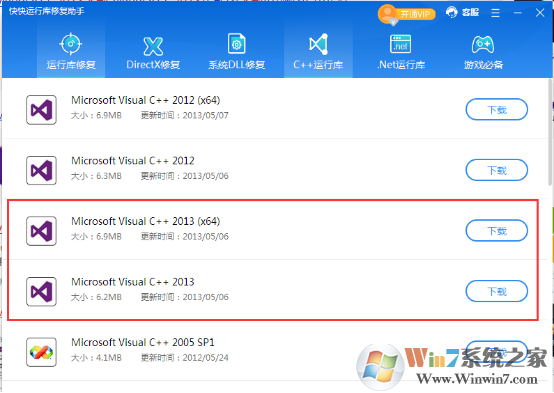 2.扫描完成后点击修复即可或者在C++运行库版面找到VC++2013运行库的安装包下载安装
