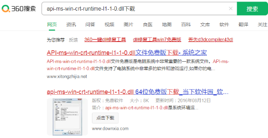 2. 打开浏览器搜索api-ms-win-crt-runtime-l1-1-0.dll下载