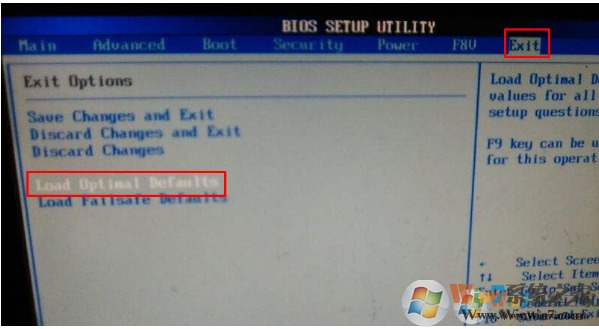 二、开机进入bios,然后使用键盘方向键向右选择到exit选项,然后找到Load Optimized Default这个选项回车选择Y即可