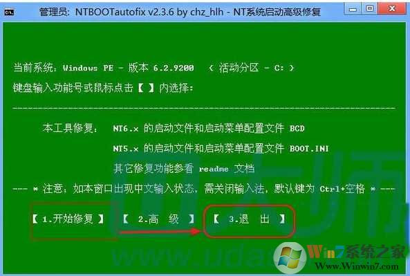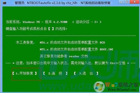 用户在另一个可以进入的系统里(或使用启动盘引导电脑启动进WinPE系统),使用第三方NT系统开机引导修复软件——NTBOOTautofix,按下面示例截图所示,进行开机启动引导修复。修复开机引导完毕后,重启电脑。就会在电脑加电开机后,出现进Win7系统的选项,选中回车,即可进入Win7系统。