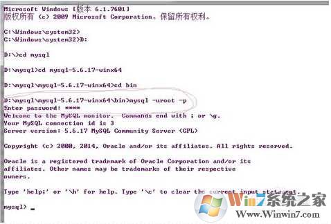1、还是将目录切换到D:\mysql\mysql-x.x.xx-winx64\bin(x.xx.xxx是什么根据你自己的版本来吧)输入mysql -uroot -p ,默认是没有密码的。回车进入,当然我的已经设置密码了,所以要输入密码才能进。有密码的话,可以mysql -uroot -p密码,也是可以是mysql -uroot -p 回车输入密码,推荐第二种,原因,你动手之后就知道了。