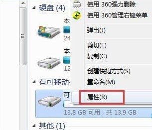 1、打开计算机,右键点击u盘,然后点击属性;