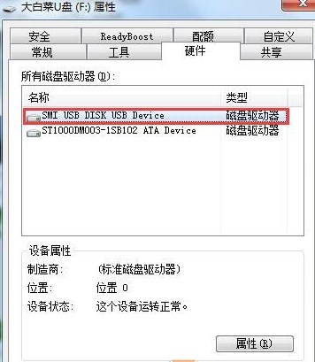 2、弹出可移动磁盘属性窗口,选择好u盘选项名称,点击属性按钮;