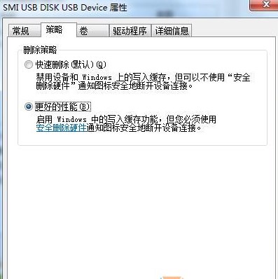 3、在u盘属性窗口中,切换选项卡在“策略”上,点击单选按钮“更好的性能”,然后点击确定按钮。