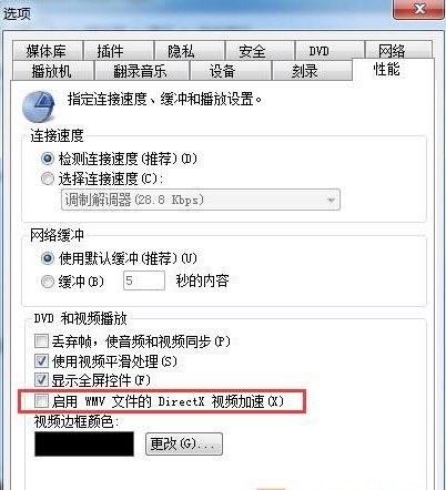 3、然后在性能选项卡取消“启用WMV文件的DirectX视频加速”勾选,修改,确定。