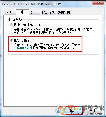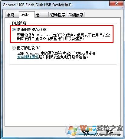 3.弹出硬件属性窗口后,选择点击“策略”,windows7旗舰版 如下图所示:
