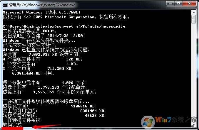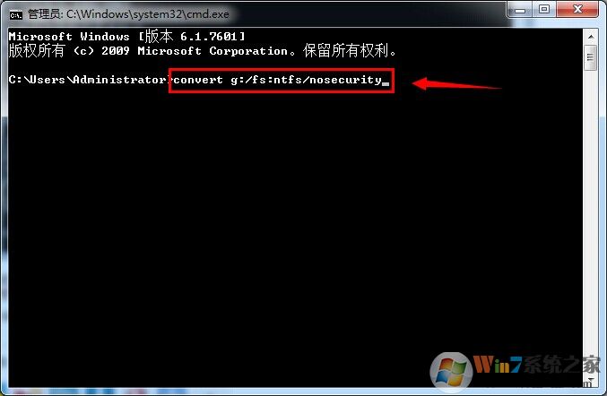 2.输入该命令convert g:/fs:ntfs/nosecurity(g就是我们U盘的盘符)按回车键执行,如下图所示
