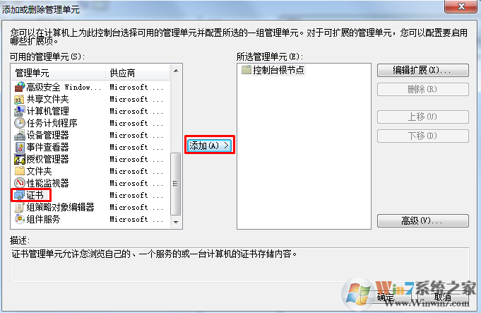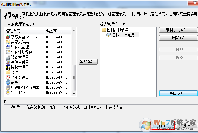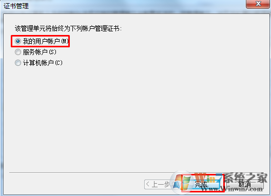 2、点击“文件”---添加/删除管理单元---选择“证书”,点击“添加”按钮,选择“我的用户账户”,完成,确定。