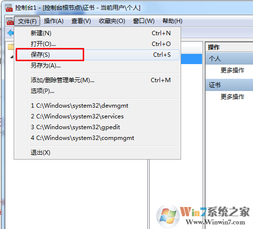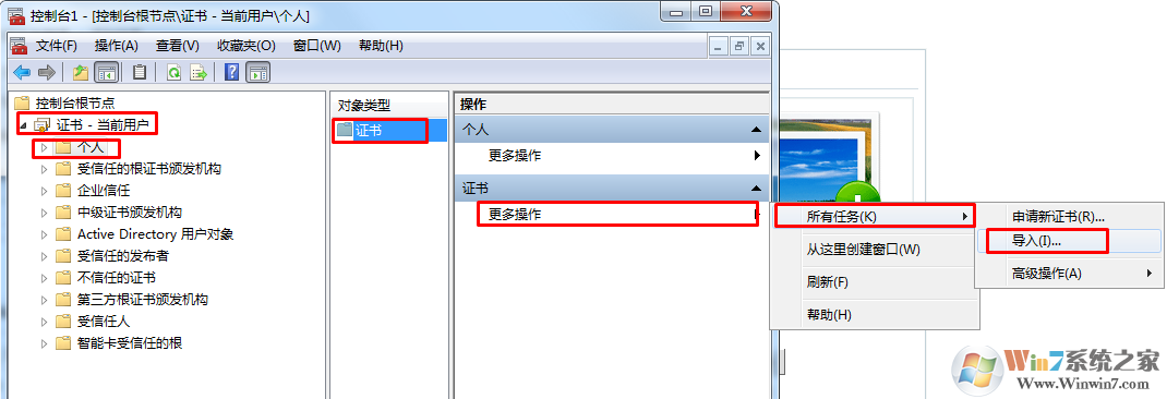 3、展开“证书”,导航到证书--个人--证书,右键单击“证书”--所有任务---导入