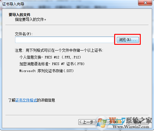 4、打开了“证书导入向导”窗口,点击“下一步”,浏览到您备份的pfx密钥证书,可能会无法找到,将浏览窗口下方的文件格式选择为“个人信息交换(*.pfx;*.p12)”,然后再去找。打开