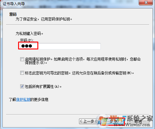 5、下一步,输入私钥密码。如果没有需要输入私钥密码,则说明原来备份的密钥没有导出私钥,将无法解密。输入后,点击下一步。