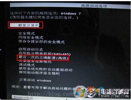 1.重启按住F8进入系统高级选项模式,然后选择最后一次正确配置恢复系统。