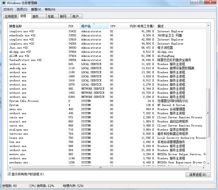 如上图所示,我们可以通过查看用户名一栏和描述一栏来确定是什么进程,
