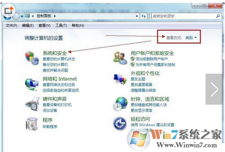 3、打开“控制面板”后点击查看方式为“类别”。点击“安全类别”;
