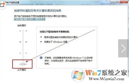 5、在 用户帐户控制设置里面把滑动条下拉到下图的位置,重启电脑后设置才能生效