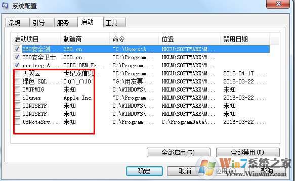 当然如果不喜欢使用注册表,那么win7 Msconfig 命令也绝对有用,打开系统配置程序后,我们在启动项中取消那些不必要的开机项,确定即可