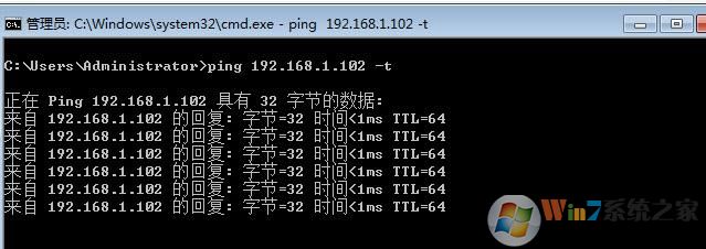 a.比如检测一下内网是否连通,假如内网其他机器的IP是192.168.1.102,我们就可以用ping 192.168.1.102 -t,-t是一直ping,如图所示: