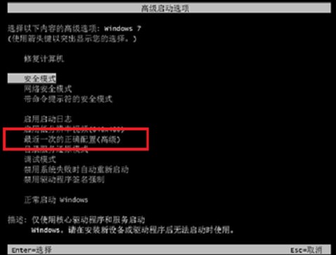 1、启动电脑后,不停点击按 F8 键,出现菜单启动选项,选择"最后一次的正确配置"选项,看可否正常进入系统,如图: