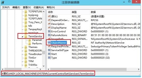(1)在安全模式下点击开始-运行-输入"regedit"命令打开注册表,进入 KHEY_LOCAL_MACHINESYSTEMCurrentControlSetservicesTermService 下面将 Name 改为:LocalSystem;,如图: