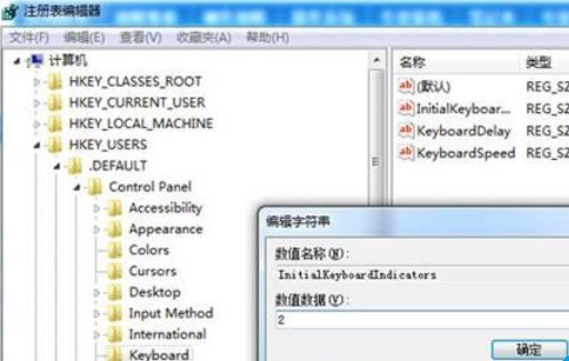 2、接着运行regedit打开注册表编辑器,定位到HKEY_USERS.DEFAULTControl PanelKeyboard,将它下面的InitialKeyboardIndicators的键值改为“2”,之后点击确定退出注册表编辑器,然后重启即可。