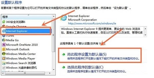 五、进入设置默认程序后,我们在此可以更改默认浏览器程序,比如我们需要将IE浏览器设置默认浏览器,那么只需要在左侧选择IE浏览器,然后在右侧操作中选择“将此程序设置为默认值”即可,如下图所示: