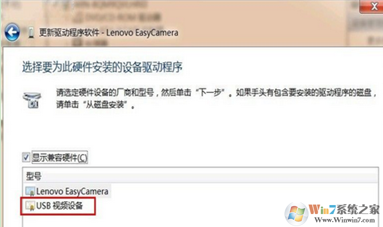 5、弹出选择为此硬件安装的设备驱动程序中,型号处选择“usb视频设备”驱动更新。